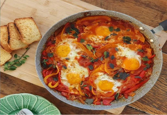 Refogue em uma panela com azeite, meia cebola finamente picada com 1 pimenta dedo de moça e alecrim (ou erva-doce), quando estiver transparente coloque um pimentão amarelo e um vermelho picados finos e refogue por mais 3 minutos. Acerte o sal, adicione 400g ou uma lata de tomates pelados e meia xicara de chá de água. Deixe cozinhar por 5 minutos, faça algumas cavidades e adicione os ovos.